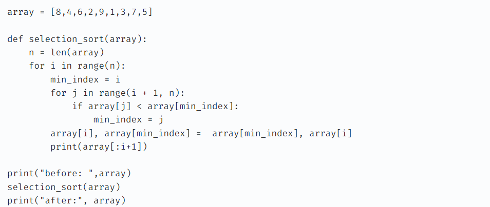 개념 : 여러 데이터중 가장 작은 값을 뽑는 동작을 반복하여 값을 정렬하는 방법