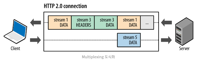 - 프레임(frame)이 각 요청의 스트림(stream)을 통해 전달되며, 하나의 커넥션 안에 여러개의 스트림(stream)을 가질 수 있게되어 다중화(multiplexing)가 가능해짐