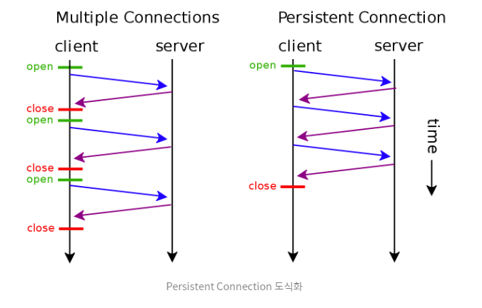 - HTTP/1.0을 보완하여 매번 TCP 연결을 하는 것이 아니라 한 번 TCP 초기화를 한 이후에 keep-alive라는 옵션으로 일정 시간동안 연결 상태를 유지