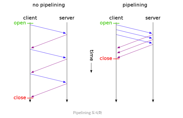 - 클라이언트는 앞 요청의 응답을 기다리지 않고 순차적으로 요청 전송, 서버는 요청이 들어온 순서대로 응답